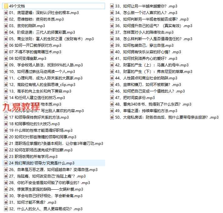 普通人逆袭指南50讲【精华】录音+课件pdf。讲解生活中遇到的不良事件的应对方法,给你应对之策和提升积极的心态,做一个愉快的普通人。注意:课程已经进行了二次压缩,需要解压才能听课。