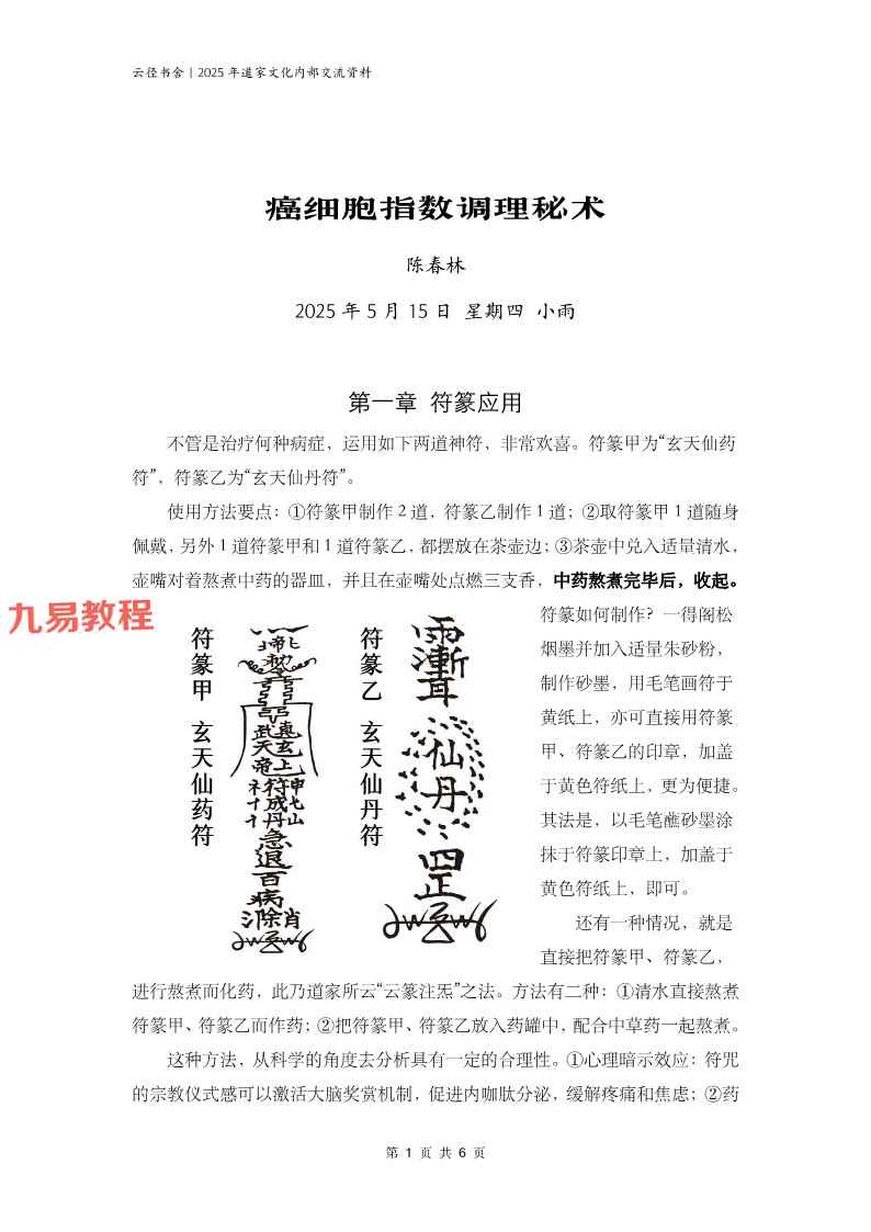 陈春林 癌细胞指数调理秘术pdf电子版,6页。包含道法和一些药方来共同对癌细胞指数调理。实际完整版应该是玄天符箓应用视频+课件,而本站最新发布的是仅是课件,也就是所谓的癌细胞指数调理秘术,仔细核对和玄天符箓应用视频课件完全相同,所以更新直接替换了整套。